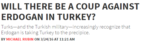 مایکل روبین پژهشگر اندیشکده “امریکن اینترپرایز” و عضو سابق پنتاگون در مقالهای که در مارس ۲۰۱۶ با عنوان “آیا امکان وقوع کودتا علیه اردوغان در ترکیه وجود دارد” WILL THERE BE A COUP AGAINST ERDOGAN IN TURKEY منتشر شد با اشاره به قرار داشتن اردوغان در لبه پرتگاه خبر از کودتای نظامی احتمالی در ترکیه میدهد.(۲)
