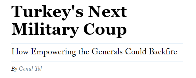 الف: سیام می ۲۰۱۶ پایگاه فارین افرز با انتشار مقالهای با عنوان ” کودتای نظامی بعدی ترکیه” ( Turkey’s Next Military Coup) به قلم گونول تول (Gonul Tol) مدیر بخش ترکیه در انستیتو مطالعات خاورمیانه در آمریکا به بررسی وضعیت رجب طیب اردوغان رئیس جمهور فعلی ترکیه میپردازد.(۱)
