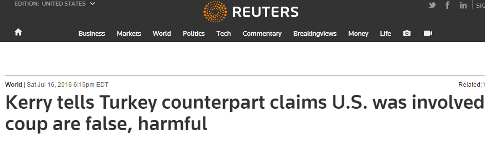 جان کری وزیر امور خارجه دولت اوباما که در زمان کودتا در مسکو به سر میبرده است در پاسخ به سوال خبرنگاران در رابطه با حوادث ترکیه بدون کوچکترین انتقادی کودتا و یا حمایت از دولت اردوغان برای ترکیه بعد از کودتا آرزوی ثبات، صلح و استمرار رویه میکند!(۳)