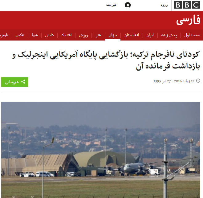 علاوه بر این خبر دخالت نظامیان پایگاه هوایی انجرلیک -که هماکنون در اختیار آمریکا برای انجام حملات هوایی در سوریه است- در کودتای چند روز گذشته نیز نشانه دیگری از نقش پررنگتر آمریکا در کودتای ترکیه است. این ظن از آنجا تقویت میشود که پس از شکست کودتا و بازگشایی مجدد پایگاه انجرلیک- فعالیت این پایگاه در ساعات ابتدایی کودتا به حالت تعلیق درآمد- ژنرال بیکر ارجان وان، فرمانده این پایگاه دستگیر شد.(۵)